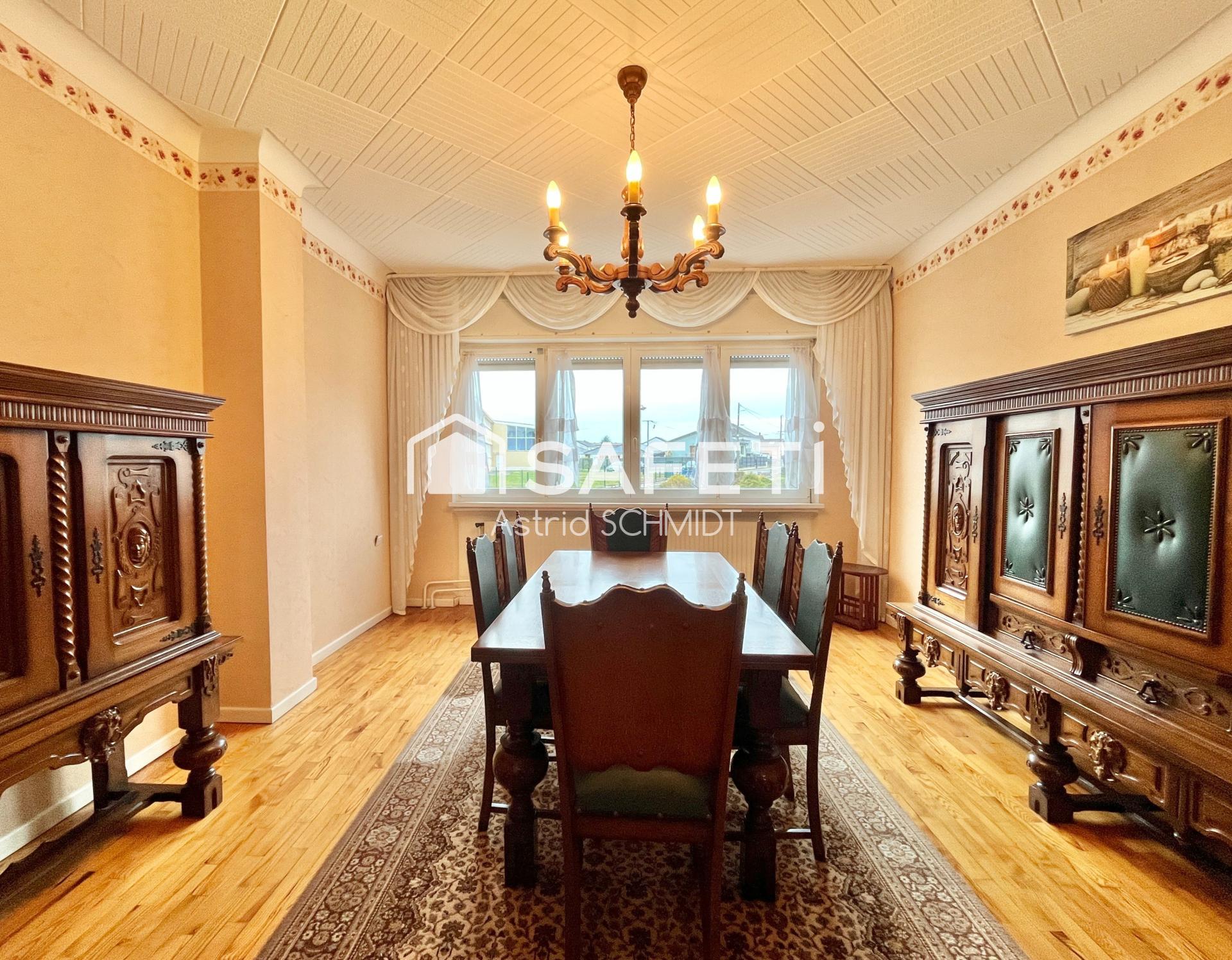 Im Erdgeschoss befinden sich ein großes Esszimmer mit angrenzender Küche, ein Badezimmer, ein separates WC, ein Schlafzimmer und ein Wohnzimmer.